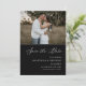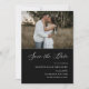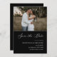 Cette invitation Photo Save the Date - comporte un texte manuscrit blanc et un texte de script élégant avec un emplacement pour votre photo. Le verso de l'invitation est d'un noir laconique.