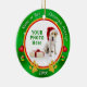Votre ornement de Noël de photo de chien est entouré avec le cadre imprimé de vert vif, les pattes d'or de chien, coeurs avec des ornements de Noël pendant de eux.