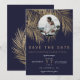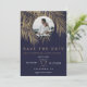 Moderne simple palmier or faux avec une typographie simple, un thème de mariage tendance et tropical save the date sur une feuille de palmier sur fond bleu marine. Ajoutez votre photo de couple