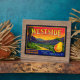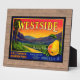 La plaque d'art de la table présente une plaque vintage colorée de la caisse de fruits Westside California Mountain Pears sur un arrière - plan à plaque de bois brun moyen.