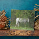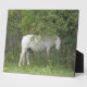 Cette magnifique plaque est ornée d'une belle photo d'un magnifique cheval blanc debout sous un arbre un peu timide.