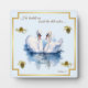 Des cygnes pacifiques sur un arrière - plan bleu. Plaque carré sur table. Il me conduit à côté des eaux calmes... 23ème psaume. Cadre et pinecones en or. Merci d'avoir cherché.