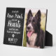 Plaque de memorial personnalisée pour animal de compagnie avec une photo de votre animal de compagnie bien-aimé, un fond en bois noir rustique et une citation de sympathie qui dit "vous avez laissé des empreintes de pattes sur nos cœurs et nous sommes à jamais changés", une empreinte de patte, un cœur, le nom de votre chien et les dates. Un beau souvenir et un hommage à votre précieux chien ou chat de famille.