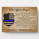 Plaque de prière de l'officier de police dans un design rustique en bois avec badge de police dans les couleurs de la police de drapeau bleu mince. Ce cadeau de prière de la police est parfait pour tous les cadeaux de remise de diplômes des officiers de police et des forces de l'ordre et de l'académie de police. Visitez notre collection pour les cartes de prière de la police et les cadeaux de prière des policiers. Personnalisez avec le nom et le numéro d'insigne des policiers. DROIT D'AUTEUR © 2021 Judy Burrows, Black Dog Art - Tous droits réservés.