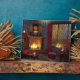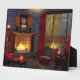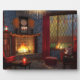 Un coin lecture confortable par jour pluvieux d'automne. Autour du foyer, un feu éclatant, des fauteuils rouges moelleux, des piles de livres, des teacakes et une théière complètent le confort. À l'extérieur, un saule jaune et une haie d'érable et de hêtre rouges sont obscurcis par la pluie qui s'enflamme, qui asperge la fenêtre où un chat gingembre s'assoit en regardant dehors.