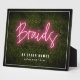 Ecriture "Braids" inspirée du néon rose sur un arrière - plan de boiseries de verdure avec texte blanc personnalisé.