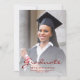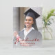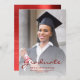 Faire-part moderne de graduation avec une photo verticale personnalisée. Le mot "Graduate" apparaît en écriture rouge, avec le nom du diplômé, l'école et l'année de graduation ci-dessous en sans serif font. Remplacez facilement l'image de l'échantillon par la photo de votre diplômé. Un écran de dégradé blanc permet de s'assurer que le texte s'affiche. L'envers comporte une image en métal brossé en faux rouge. Idéal pour obtenir un diplôme d'études secondaires ou collégiales.