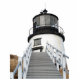 Une perspective unique qui regarde le phare du bas des escaliers qui y mènent. Le phare blanc et noir se détache du ciel bleu derrière et de la couleur marron clair de l'herbe du début du printemps. Un complément parfait à toute collection d'amoureux des phares.