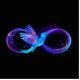 Glowing, purple infinity symbole with flying, luminous, blue hummingbird on black background. Néon.