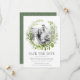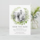 Notre prairie sauvage enregistrez la carte de date encadre votre photo fiançailles préférée avec une couronne ronde de verdure aquarelle peinte dans des tons luxuriants de vert printemps, d'olive et de fougère. Un choix moderne mais bio pour les mariages du printemps ou de l'été avec des feuilles verts frais dans la couleur de l'année 2017. Personnalisez avec vos noms, date mariage, emplacement et site Web mariage en utilisant les champs fournis.