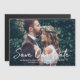 Annoncez votre date de mariage à votre famille et à vos amis! Ce mariage moderne sauvegarder la date faire-part carte design comprend une photo horizontale du couple engagé sur le devant avec un blanc brossé "Save our Date" script de calligraphie superposition et un monogramme de noms de mariée et mariée et de date de mariage qui peut être personnalisé. Notez que la couleur du texte blanc peut être modifiée.