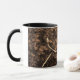Tasse à aiguille affichant roue de vélo décomposée et guidon avec cloche abandonnée dans les bois.