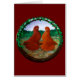 Un Tumbler roux et jaunes grace cette plaque peinte, avec une forêt de vert derrière eux et un treillis les entoure. Ces oiseaux sont des pigeons de luxe populaires en exposition.
