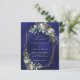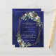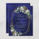 Pour un mariage d'hiver. Un arrière - plan bleu marine aux couleurs irrégulières décoré de cônes, de baies blanches et de verdure. Un cadre géométrique en faux or. Personnalisez et ajoutez vos noms et détails. 1 feuille = 1 invite imprimé bord à bord.