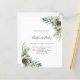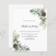 Arrière - plan blanc, décoré de cônes de pins, baies blanches, feuilles verts. Personnalisez et ajoutez les détails de votre fête. Lettres noires. 1 feuille = 1 invite imprimé bord à bord.