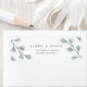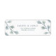Étiquettes d'adresse de retour personnalisées avec branches de pin vert et bleu contre un arrière - plan blanc avec un texte moderne simple. Parfait pour les mariages rustiques, occidentaux et de montagne.