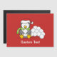 Un petit dessin de pingouin avec chapeau santa et foulard vert assis et tenant une boule de neige.