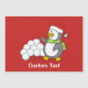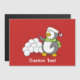 Un petit dessin de pingouin avec chapeau santa et écharpe verte agitant devant une pile de boules de neige.