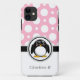 Coque iPhone 5 mignon et classe conçu dans un assortiment de motif pois rose et blanc, avec un adorable petit pingouin noir arrondi, et imprimé sur mesure avec votre nom ou texte personnalisé.