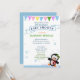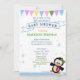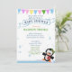 Baby shower de pingouin mignon invitation.. Arrière - plan coloré. Penguin a un arc vert et se tient sur un iceberg. Kristi W/Graphic's n Bits.