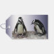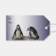 Ce pack de étiquettes cadeaux comporte deux adorables pingouins africains debout sur une corniche rocheuse. Ce sont des oiseaux aquatiques sans vol dont les ailes sont devenues des palmes. Chacune a une bande noire et des taches noires sur la poitrine. Le motif de taches est unique pour chaque pingouin, tout comme les empreintes digitales humaines. Ils ont des glandes roses au-dessus des yeux et des pieds roses et noirs. L'image est répétée à l'arrière.