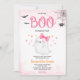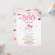Fêtez l'arrivée prochaine avec notre charmant Baby shower "Pink A Little Boo" Invitation! Cette adorable invitation présente un fantôme amical portant un ruban rose, entouré de chauves-souris géantes, une toile d'araignée ludique avec une mignonne araignée pendante, et une araignée d'étoiles orange et rose. BBS451