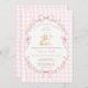 Featuring a soft pink gingham background, a sweet watercolor baby lamb with a bow, and a floral + ribbon wreath framing your party details, this invite is charming, gentle, and perfect for welcoming a baby girl.
