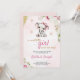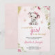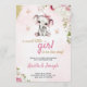 Pink baby shower invitation with a cute elephant illustration wearing a bow, surrounded by flowers and butterflies. Text details a baby shower event.