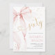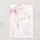 Pink Bow 60th birthday invitation. Modern feminine design in blush pink and gold. Features trendy watercolor coquette bow, and heart script font "sixty". Perfect for an elegant style women's bday celebration. Personalize with your own details. Printed Zazzle invitations or instant download digital printable template.