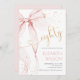 Pink Bow 80th birthday invitation. Modern feminine design in blush pink and gold. Features trendy watercolor coquette bow, and heart script font "eighty". Perfect for an elegant style women's bday celebration. Personalize with your own details. Printed Zazzle invitations or instant download digital printable template.