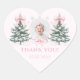 Add a sweet touch to your Winter Onederland celebration with this heart-shaped sticker featuring a soft pink bow, frosty trees, and elegant lettering that says “thank you.” Perfect for sealing envelopes, favor bags, or small gifts with winter charm.