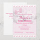 Design features a light pink background to the image of a pink bow amid white puffy clouds. Top and bottom are bordered by white with the images of tiny pink bows. Text is featured in a bright pink, the name of guest of honor in a large, elegant font. Event type is displayed in a large, bold font. Date and time are displayed below in an easy-to-read print. R.S.V.P. information is displayed at bottom.
