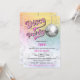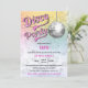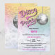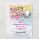 © 2023 Socialite Designs Inc. & LICENSORS. Célébrez une fête d'anniversaire disco en invitant les invités avec cette invitation amusante et rétro de fête d'anniversaire disco. Les couleurs sont argent, blanc, parties scintillant rose chaud et gris. Le design intègre une boule disco argentée et des lampes à cordes blanches, avec bokeh comme arrière - plan.