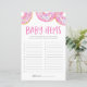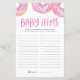 Quel objet bébé commence par chaque lettre ? Pouvez-vous deviner ce que la future maman a écrit ? | Ajoutez cette amusante carte de jeu Baby Items à votre baby shower. Cette carte de jeu trivia baby shower présente des beignets d'aquarelle rose avec des arrosages colorés. Personnalisez en ajoutant des noms, des événements et des dates. Ce beignets rose Baby Items est parfait pour toute saison de baby shower ou de thème.