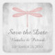 Mariage simple et élégant Stickers Enregistrer la Date avec une libellule rose contre un arrière - plan gris grunge. Ce design est un choix unique pour annoncer un mariage moderne. Facile à customiser avec vos détails mariages. Cliquez sur "Customiser" pour trouver d'autres options de personnalisation.