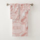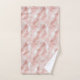 Beautiful pink and white feathers cover these lovely bathroom towels with a monogrammed center.