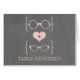 Lunettes geeky chic et sexy Tableau Numéro Carte en rose clair avec un coeur mignon flanqué de deux paires de lunettes nerveux, une paire de manteaux et une paire de ceintures représentant le marié et la mariée sur un arrière - plan de tableau noir. Cette carte table décalée est parfaite pour votre mariage geek ! Facile à customiser, il suffit d'ajouter le ou les numéros de table appropriés dans le champ de texte fourni. Cliquez sur le bouton "Customiser" pour trouver d'autres options de personnalisation.