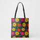 A lively garden of color blooms against a deep black backdrop, featuring flowers in pink, yellow, orange, and red‑orange, framed by soft green leaves and accented with petite blue flowers that add a playful pop of contrast. The bold palette and clean symmetry create a joyful, eye‑catching design that feels both modern and whimsical — perfect for brightening everyday errands or adding a touch of artistic charm to your look.