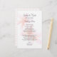 Abordable et joli, plumeria rose mariage modèle à la carte. Cartes blanches avec texte noir moderne. Noms en haut, avec un lieu pour l'emplacement et la date de l'événement. Titre du menu, avec tous les aliments et boissons listés dans le formulaire de paragraphe. Utilisez des espaces pour créer des titres de section et répertorier autant d'éléments que vous le souhaitez. Les fleurs de plumeria rose pâle sont l'image arrière - plan, avec un motif de fleurs à l'arrière du menu. Choisissez le papier que vous préférez, le lin est représenté.
