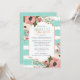 Élégante et moderne invitation à la douche nuptiale pour les amateurs de fleurs de pavot avec des accents de fleurs de pavot et des tons de rose muet avec une verdure luxuriante éclatant, décoration centrale pour zone de texte sur arrière - plan rayé de jade pâle. Personnalisez avec vos détails de douche nuptiale en jade pastel doux, bronzé, et vieille typographie marine accentuée de calligraphie de style manuscrit et sans-serif. Carte inversée à un solide jade pâle avec des pois métalliques en faux or.