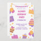 Pink Purple Playful Simple anniversaire de enfant invitation, Anniversaire fêtes Invitations comprennent des arrosées de bonbons pastel, nom et âge gras, casquettes de fête et des bougies. Customisez le texte à l'aide du bouton Modifier pour personnaliser vos invitations.