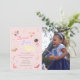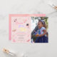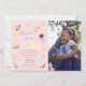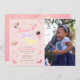 Cette invitation à l'anniversaire de 4e anniversaire présente les années 70 texte rétro, des couleurs rose et violet et des illustrations spatiales. Les illustrations sont des planètes, des étoiles et un navire-fusée. Le dos est une galaxie rose, ce qui en fait l'invitation parfaite pour célébrer votre petit astronaute.