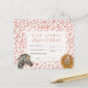 Carte de certificat d'adoption de fête d'anniversaire de la fille thème safari mignonne avec l'illustration d'un lion et zèbre avec fleur et casquette de fête. L'arrière - plan est un motif léopard rose. Offrez des animaux farcis pendant la fête comme une faveur de fête avec ce certificat!