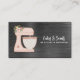 Un mignon mélangeur de gâteau rose avec des fleurs sur un arrière - plan métallique gris foncé décore ce carte de visite de boulangerie. Personnalisez-le avec votre nom et vos informations commerciales. Conçu pour vous par Blackberry Boulevard.