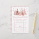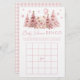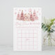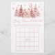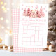 Jeu classique sophistiqué "Bingo" conçu pour une douche bébé fille, orné d'un charmant ours en peluche portant un joli arc rose, tenant un ballon rose, entouré de pins et de flocons de neige. Engagez vos invités avec ce jeu délicieux, parfait pour ajouter du plaisir et de l'excitation à votre fête d'hiver tout en créant des souvenirs chéris.