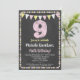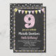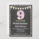 Une invitation funky à 9e anniversaire rose et jaune de tableau noir avec du texte à la craie croustillante en haut avec un arrière - plan de tableau noir, des drapeaux et une jolie bordure de pois-pois.