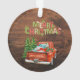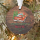 Camion rouge avec des cadeaux et des pins en texture bois.