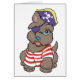 Un chiot potelé mignon de pirate portant une chemise rouge et blanche de rayure, le casquette du pirate, et la correction d'oeil, une conception unique de pirate parfaite pour les amoureux de les chiens qui aiment également des pirates !