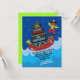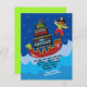 Adorable invitation pirate avec perroquet et main crochet! Il vole dans un bateau à tête de dragons verts, au fond des vagues