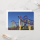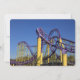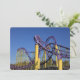 Photographie d'une piste de dessous de verre à rouleaux peint en violet et jaune sous un ciel bleu clair